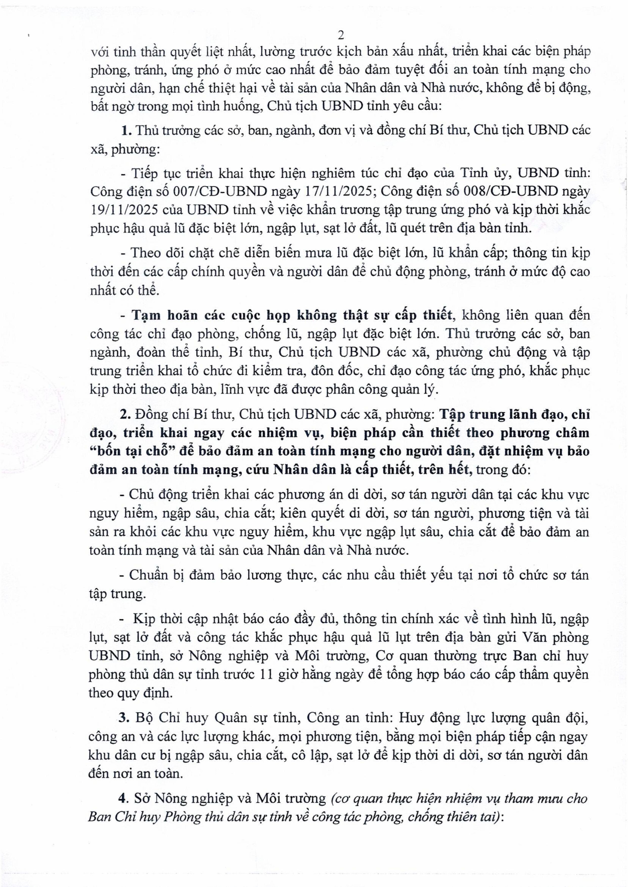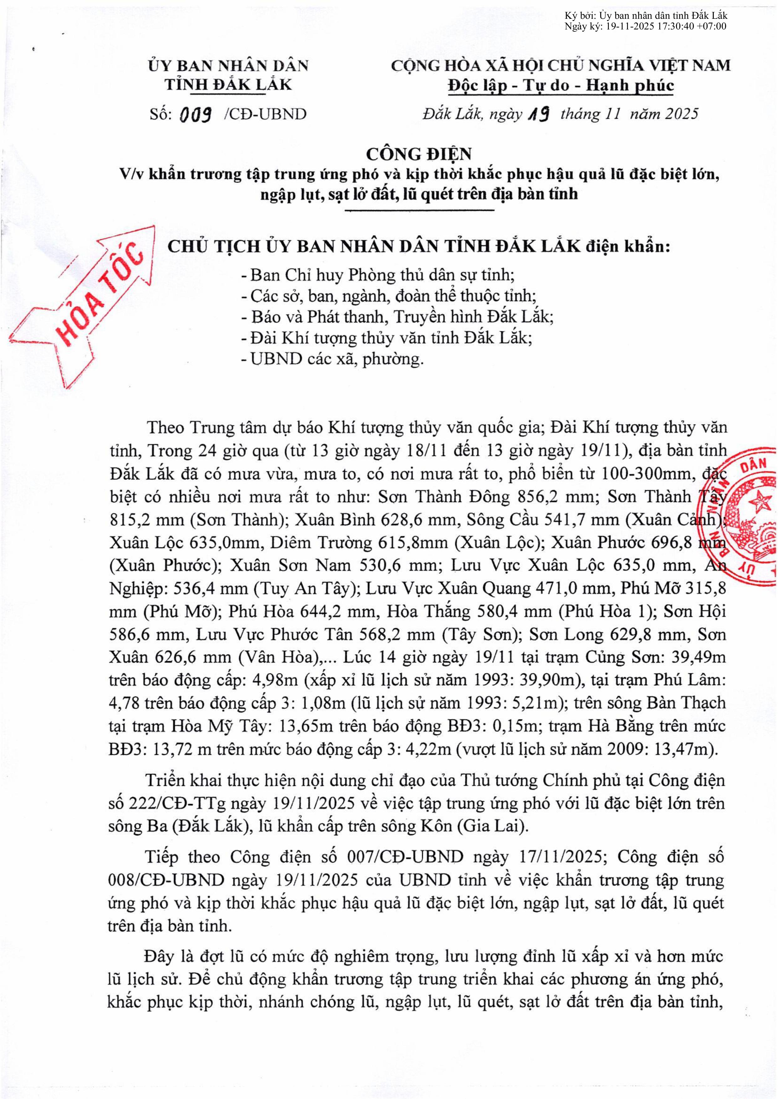 Công điện của Chủ tịch UBND tỉnh Đắk Lắk về việc khẩn trương tập trung ứng phó và kịp thời khắc phục hậu quả lũ đặc biệt lớn, ngập lụt, sạt sở đất, lũ quét trên địa bàn tỉnh
