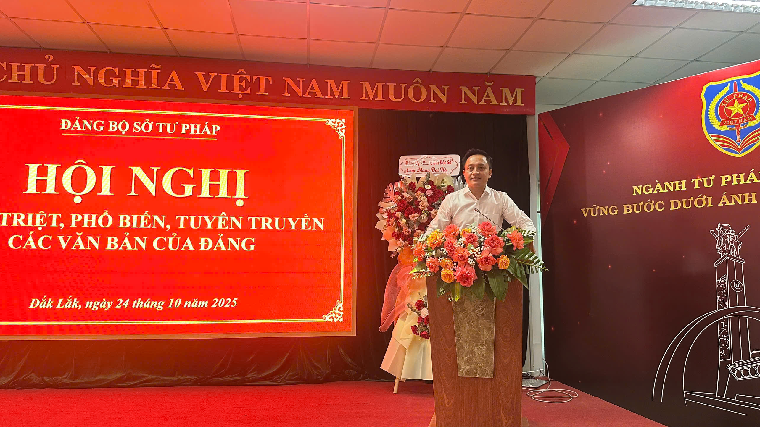 Thực hiện Kế hoạch của Đảng ủy Sở Tư pháp về tổ chức nghiên cứu, học tập, quán triệt, phổ biến, tuyên truyền kết quả Hội nghị lần thứ 13 Ban Chấp hành Trung ương Đảng khóa XIII, Nghị quyết Đại hội đại biểu Đảng bộ Ủy ban nhân dân tỉnh lần thứ I, nhiệm kỳ 2025 - 2030 và Nghị quyết Đại hội đại biểu Đảng bộ tỉnh Đắk Lắk lần thứ I, nhiệm kỳ 2025 - 2030; chiều ngày 25/10/2025, Đảng ủy Sở Tư pháp đã tổ chức Hội nghị quán triệt, phổ biến, tuyên truyền đến toàn thể đảng viên, quần chúng trong Đảng bộ Sở.