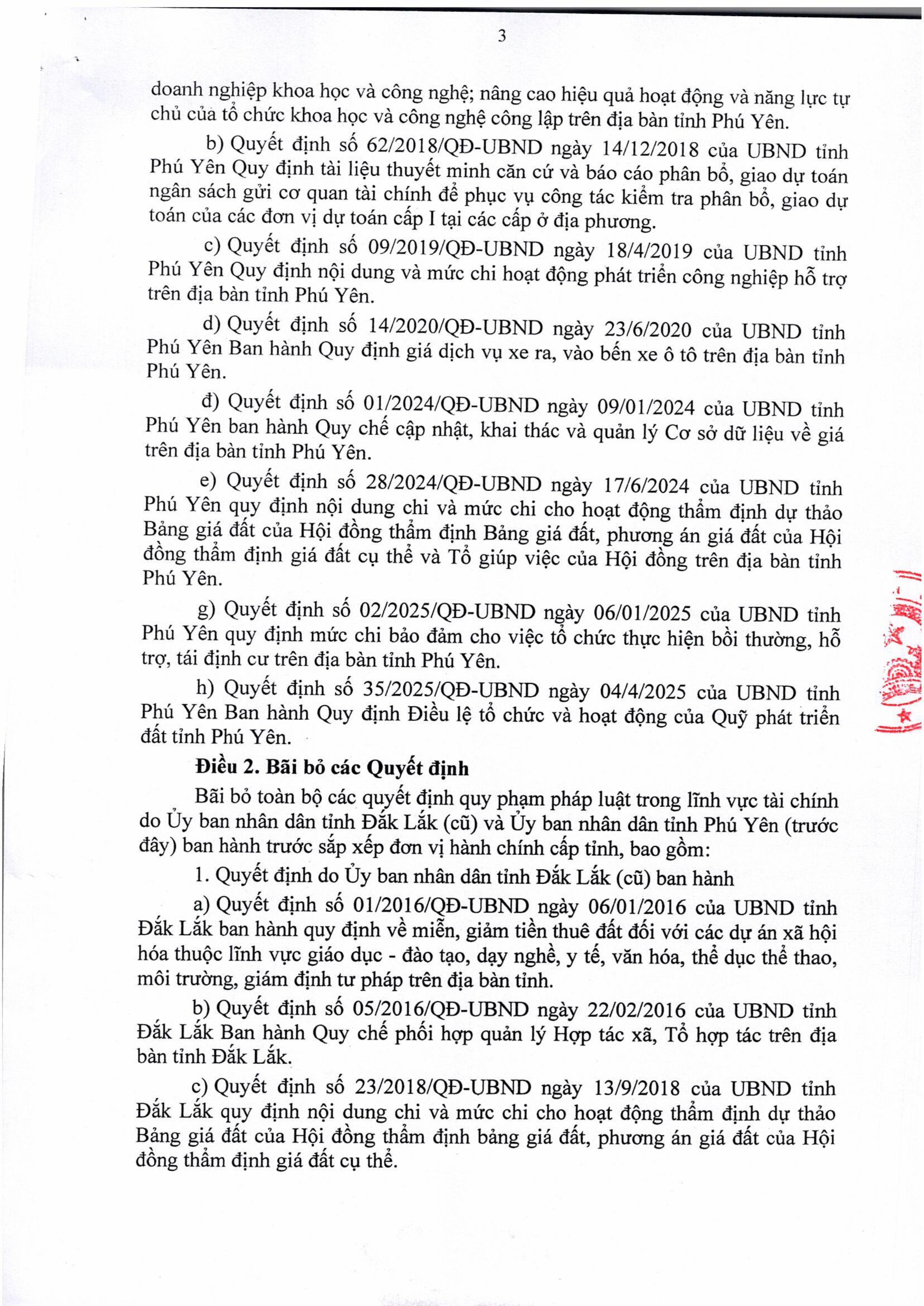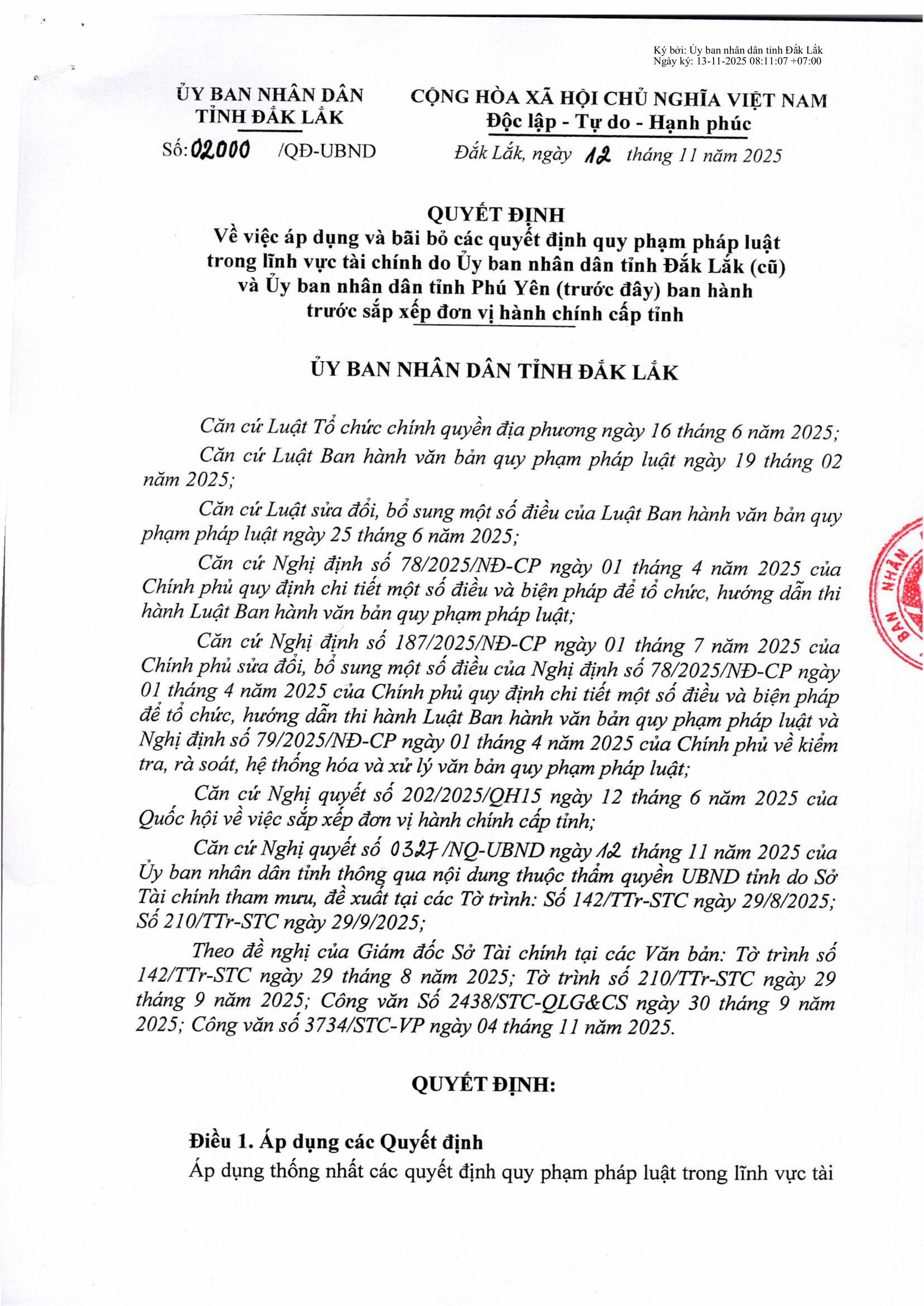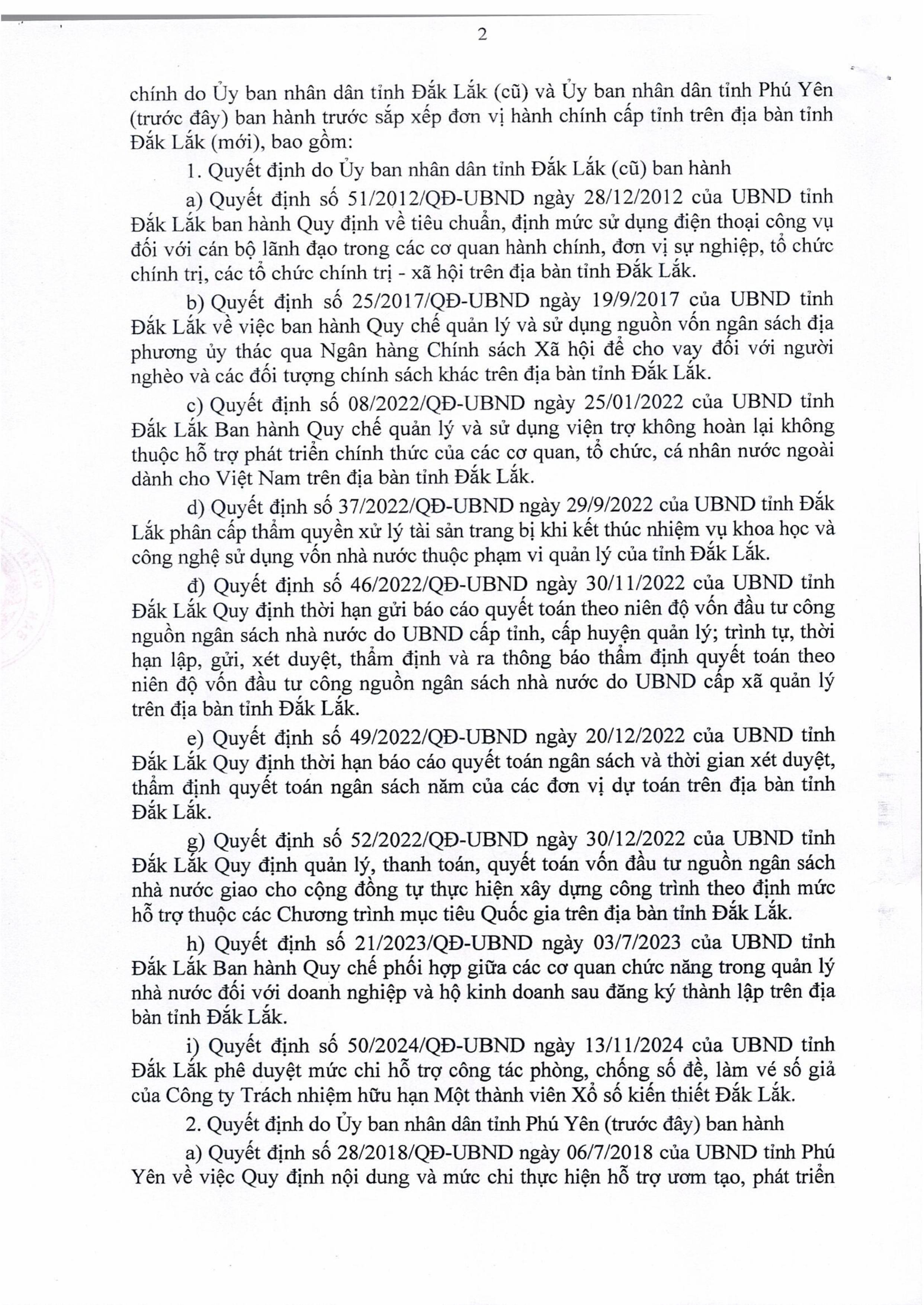 Quyết định áp dụng và bãi bỏ các quyết định quy phạm pháp luật trong lĩnh vực tài chính do Ủy ban nhân dân tỉnh Đắk Lắk (cũ) và Ủy ban nhân dân tỉnh Phú Yên (trước đây) ban hành trước sắp xếp đơn vị hành chính cấp tỉnh