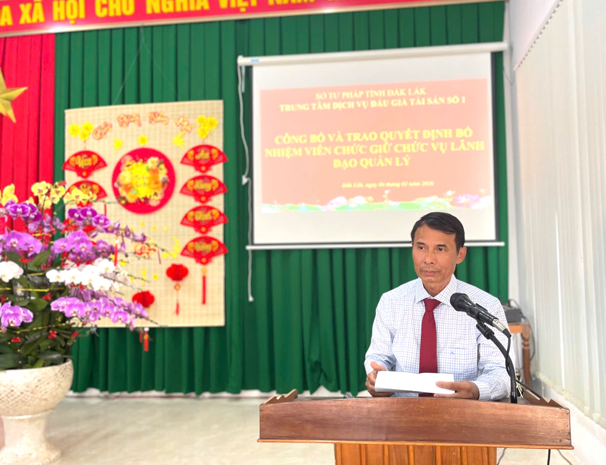 Chiều ngày 06/02/2025, Sở Tư pháp tổ chức Lễ công bố và trao Quyết định bổ nhiệm Giám đốc, Phó Giám đốc Trung tâm Dịch vụ đấu giá tài sản số 1. Dự và chủ trì buổi lễ có đồng chí Nguyễn Tuấn Quang – Phó Bí thư Đảng ủy, Phó Giám đốc Sở Tư pháp; tham dự buổi lễ có đại diện Văn phòng Sở và tập thể viên chức Trung tâm Dịch vụ đấu giá tài sản số 1.