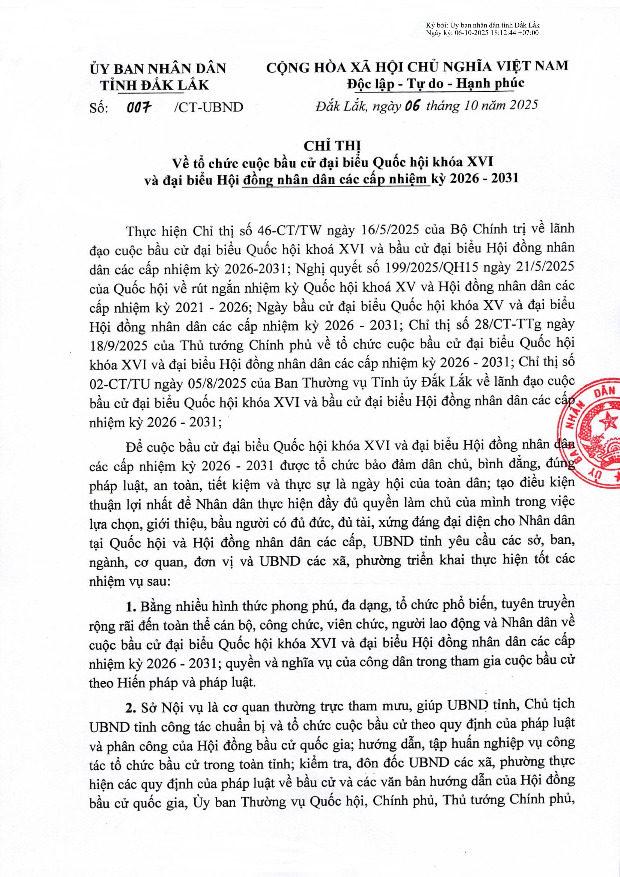 Ủy ban nhân dân tỉnh Đắk Lắk ban hành Chỉ thị về việc tổ chức cuộc bầu cử đại biểu Quốc hội khóa XVI và đại biểu HĐND các cấp nhiệm kỳ 2026-2031
